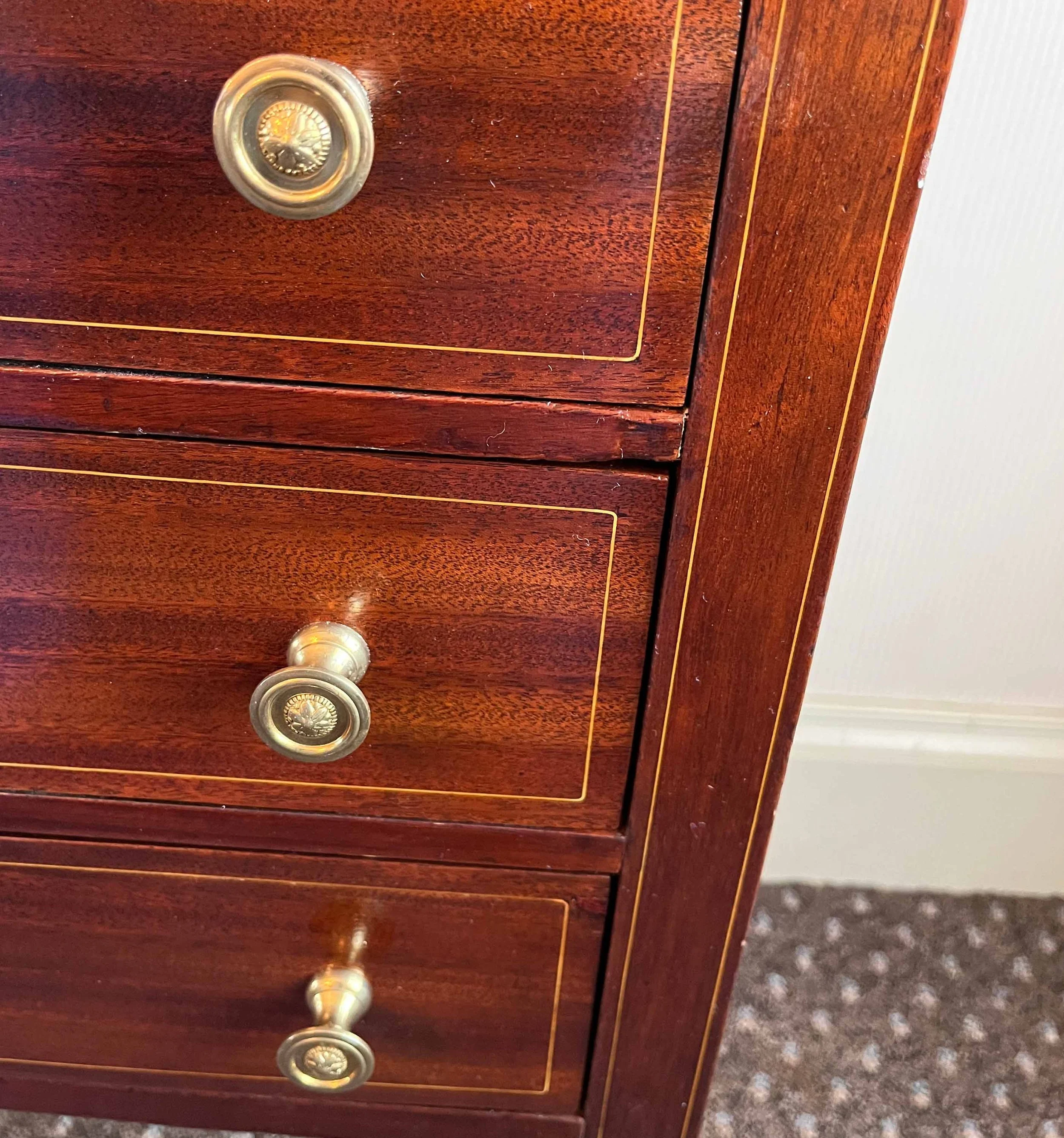 Fast forward to 2019 and my restoration. Made by the George C. Flint Co. in NYC, based on markings the piece pre-dates 1934 when the company changed logos. It has superior mahogany veneer on the lid and top, and solid mahogany sides and legs. Delicate satinwood inlay is used throughout. I was able to re-use the lid veneer but replaced the original inlay and banding with a custom replacement.